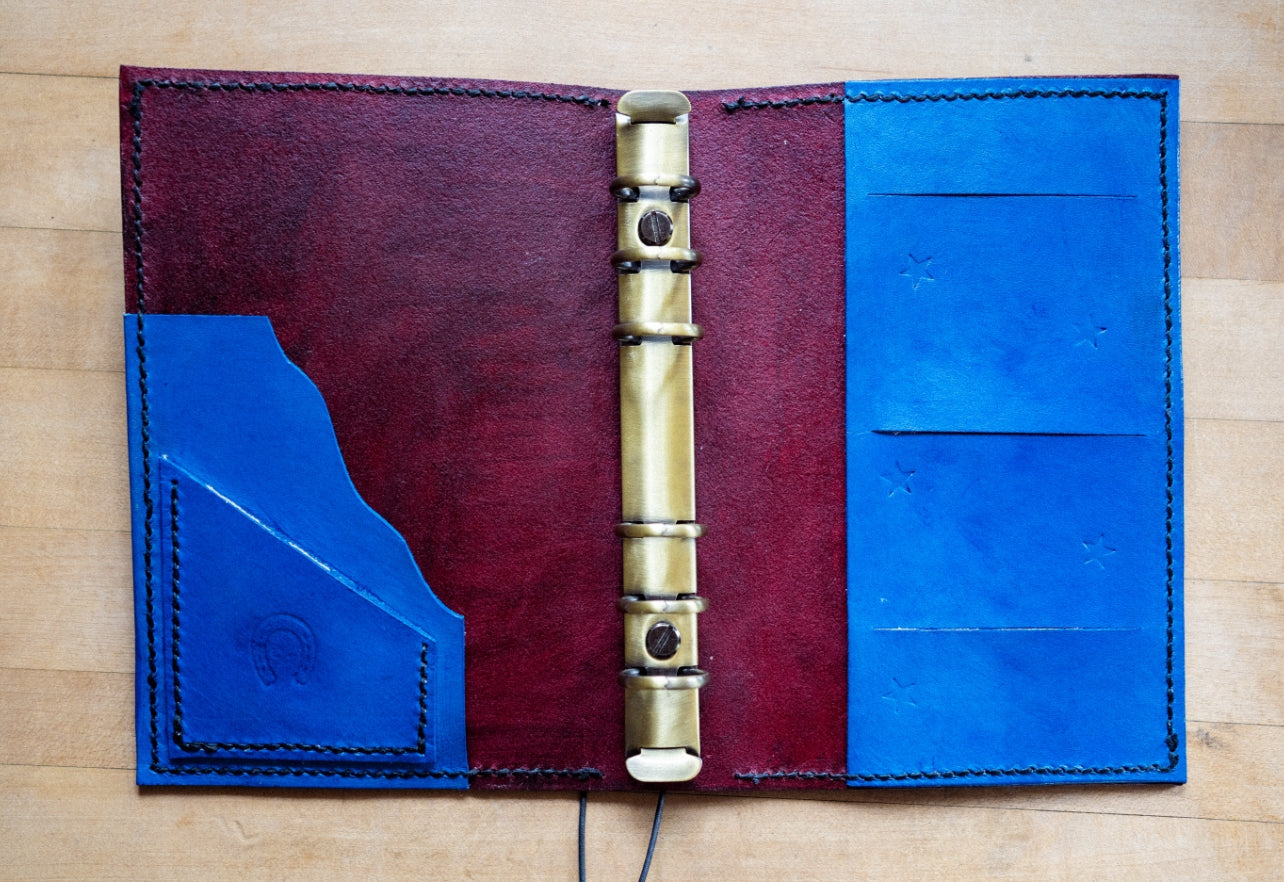 This maroon binder is the Auto's 6-Ring Binder DELUXE system in personal size. Used in product testing, this binder is fully functional but has some defects that make it a B-Grade cover. Nothing about the cover is unusable, just some features are not up to our A Grade standards!